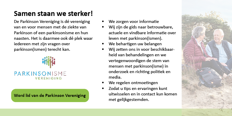Praktijk Oefentherapie Roerade is actief deelnemer binnen het landelijke en regionale Netwerk ParkinsonNet. Het Netwerk kan niets zonder zijn deelnemers, maar ook niet zonder een actieve patiëntenvereniging zoals de Parkinsonisme Vereniging. Een inspirerende en actieve Vereniging die zich inzet voor een zo goed mogelijke kwaliteit van leven voor de ruim 63.500 mensen met de ziekte Parkinson of een parkinsonisme en hun naasten. Bij de Parkinson vereniging ondersteunen, helpen en versterken we elkaar. Dus de moeite waard om een kijkje te nemen op de website van deze actieve Vereniging.